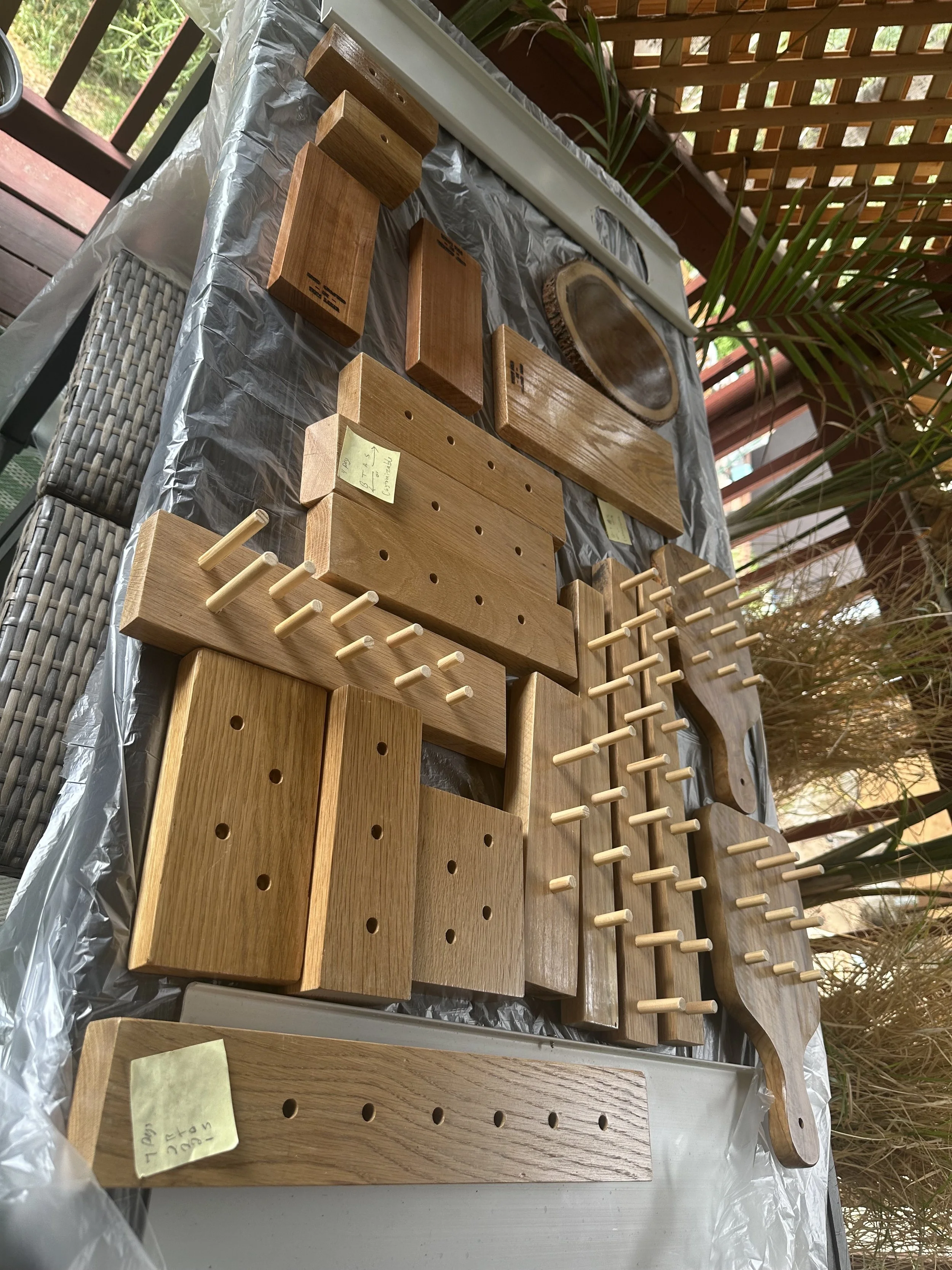 Each stand I create is truly one of a kind. I leave many of the natural imperfections—marks, dents, odd cuts—intact. The dowels are hand-tapped, not glued, and while the boards are sealed, the dowels are left unfinished to reduce toxins where your mouthpiece rests.